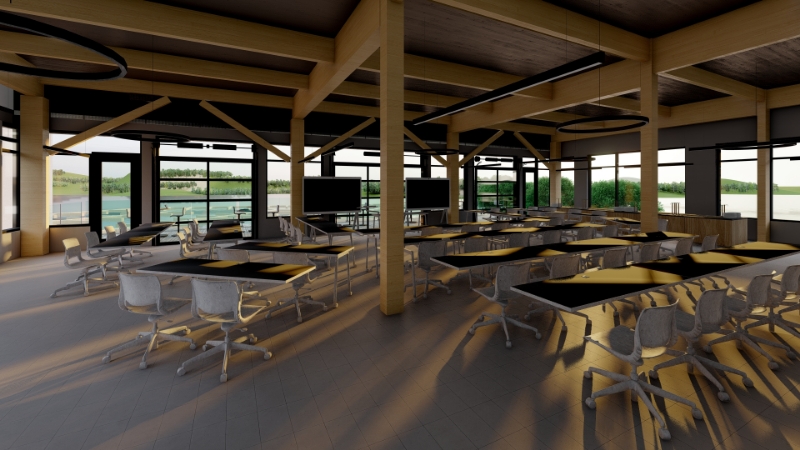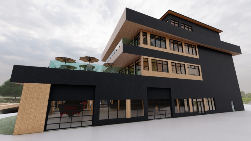 Adelaide Pointe in Muskegon, MI is a stunning 30-acre waterfront property that displays harmonious blend of modern architecture and natural beauty. This innovative development features the largest mass timber concentration of buildings in all of Michigan. The main floor of this one of a kind building houses yacht sales. Within the same structure, the Muskegon Brewing Company offers a dining experience with breathtaking views of the water. In addition to the brewery, there is an event space and office spaces that open to outdoor terraces, allowing for the flow between outdoor and indoor events