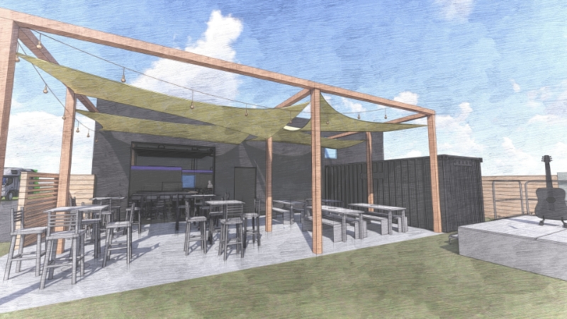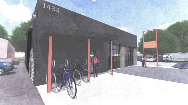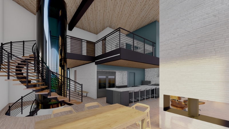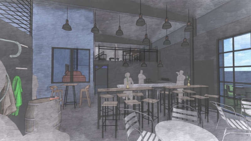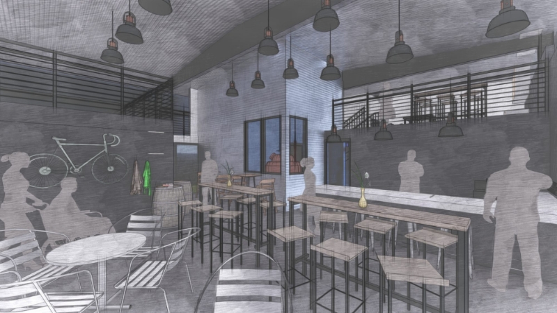 This architectural design for a combined Loose Spokes Bike Shop and Off The Chain Brewstillery presents an innovative concept that harmoniously integrates two distinct yet complementary experiences under one roof. The building features a blend of reclaimed wood and corrugated metal siding, evoking an industrial yet welcoming aesthetic.